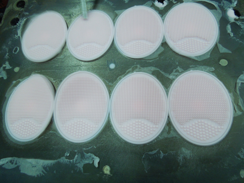 首先產(chǎn)品的注意工作主要在于模具,由于潔面刷模具的結(jié)構(gòu)比較復(fù)雜,模具是采用三層模具制作,模芯需要從機臺上取下在用人工拉扯方式將產(chǎn)品從模板上取下,所以在取下的過程當(dāng)中可能會導(dǎo)致刷頭斷裂在模芯當(dāng)中,這就會導(dǎo)致產(chǎn)品出現(xiàn)不良,而為發(fā)現(xiàn)的情況下又會導(dǎo)致第二次模壓時出來的產(chǎn)品連續(xù)不良,所以在生產(chǎn)潔面刷的過程當(dāng)中,剛生產(chǎn)出來的產(chǎn)品對于檢貨是非常重要的,如當(dāng)時未發(fā)現(xiàn)問
